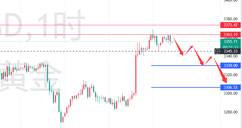 具体操作思路:有参考上周五的3363做空的可看3345位置能否下破;空仓的可等待3363附近再去布空看跌,保护3374,目标下看3345附近;短线方面是建议在45附近止盈 ,有破位动作后等待金价反弹3352附近再介入空单下看,中线可减半仓看持续看金价向下运行是否能到3330位置后去看阶梯目标 。